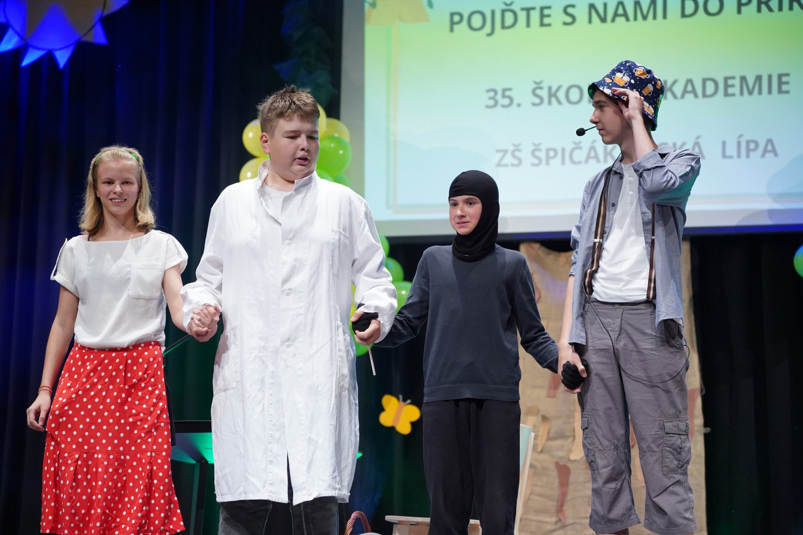 Úvod a moderování celé akademie patřil Tomášovi a Pavlovi z 9. B a také malé Zorince z přípravné třídy 0. C. Vše se vázalo a pojilo s přírodou, kterou dotvářeli žáci a kamarádi z 8.C, ale vlastně to byli “přátelé ze zeleného údolí”, kam celá základní škola na Špičáku, přesunula výuku.