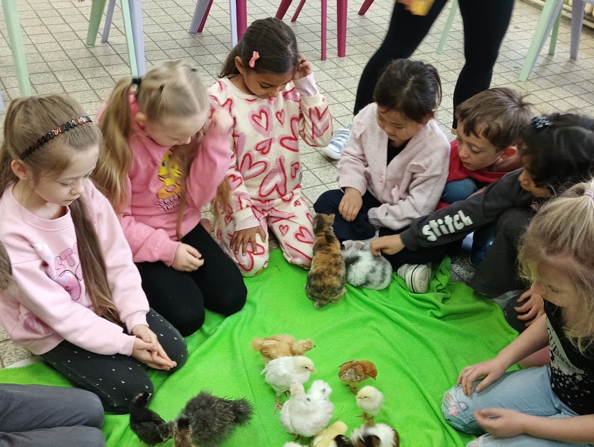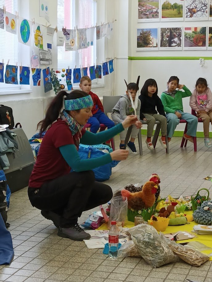 Nejprve byla trochu teorie, ale pak se z přepravek začaly vynořovat slepice, kuřata, králíci, morčata. Děti nejprve překvapeně koukaly, ale pak si téměř všichni nějakou živou učební pomůcku přivlastnili. Ze židle vše kontrolovaly dvě ochočené slepice, které nakrmené a spokojené seděly na židlích lépe než někteří žáci. Na závěr přišlo to největší překvapení, z přepravek vykouklo malé jehně a kůzle. Názorné pomůcky jsou prostě nej…