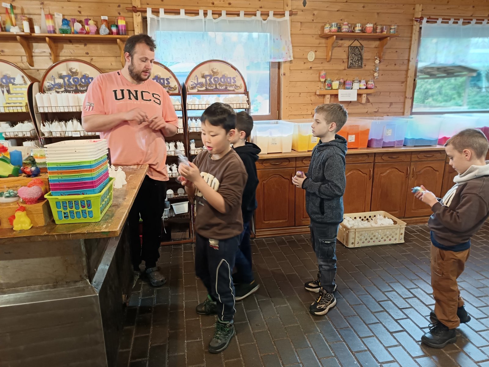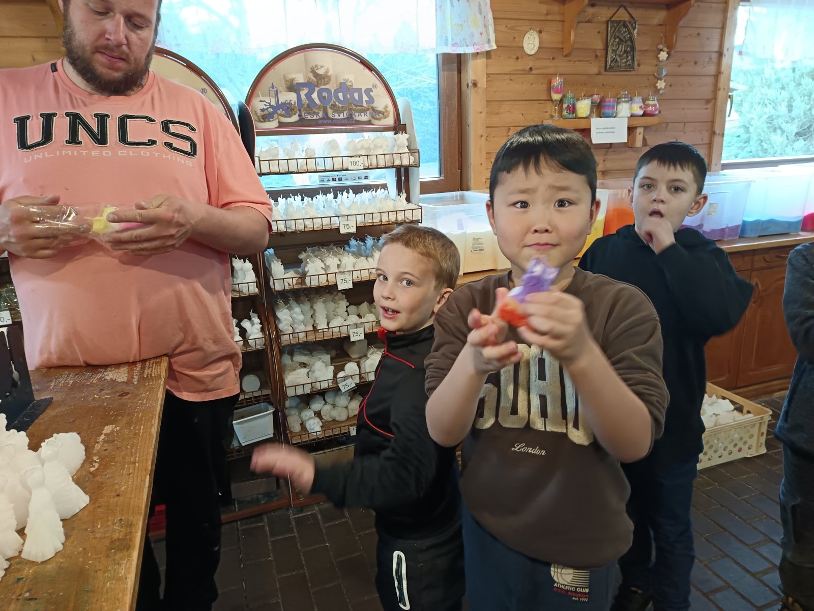 Nedělalo nám problém pracovat pod cizím vedením a vyrobili jsme krásné velikonoční svíčky. Dokázali jsme namíchat voňavou koupelovou sůl a dozvěděli se zajímavosti o jejích léčivých vlastnostech. Nakupovali jsme dárky a počítali peníze. V areálu svíčkárny je malá farma. Takže - viděli jsme mláďátka domácích zvířat. Moc roztomilá byla telátka, selátka, králíci, oslíci... Zjistili jsme, že se o ně musí člověk svědomitě starat a zopakovali jsme si, jaký užitek člověku přináší. No, není to na velkou jedničku z prvouky?