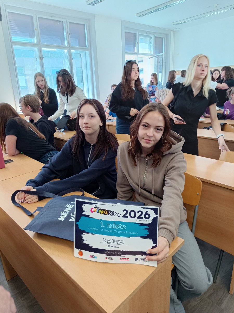 Máme radost, že „hrupka“ získala opět 1. místo v krajském kole Libereckého kraje a tím si zajistila postup do celostátního finále do Brna. Konkurence byla silná a všechny redakce odvedly skvělou práci. Naši redakci porota ocenila především za moderní přístup, kreativitu a kvalitu obsahu, který se nám stále daří tvořit. Oceněna byla i grafická podoba, především kresby žáků školy, komiksy a srozumitelnost textů – tedy to, na čem jsme pilně pracovali.
