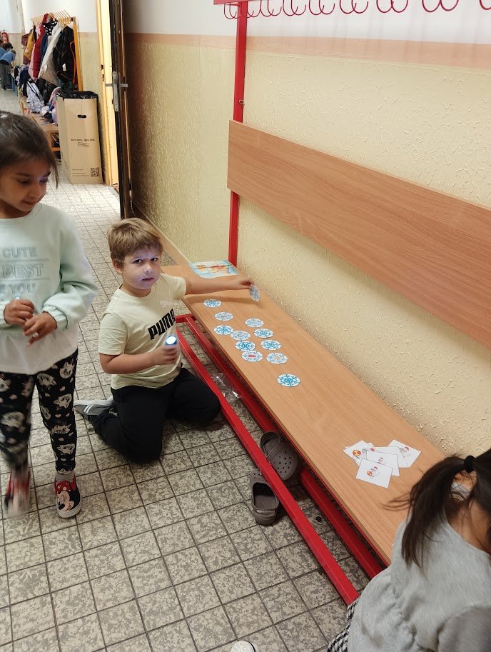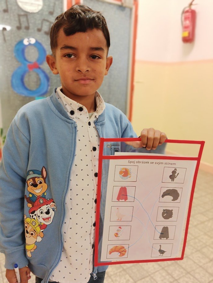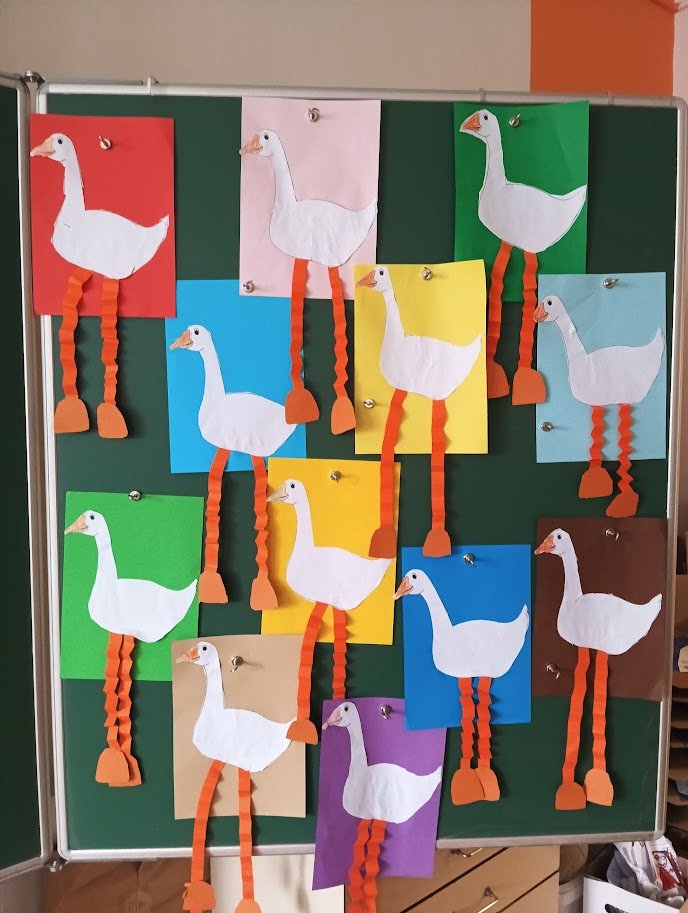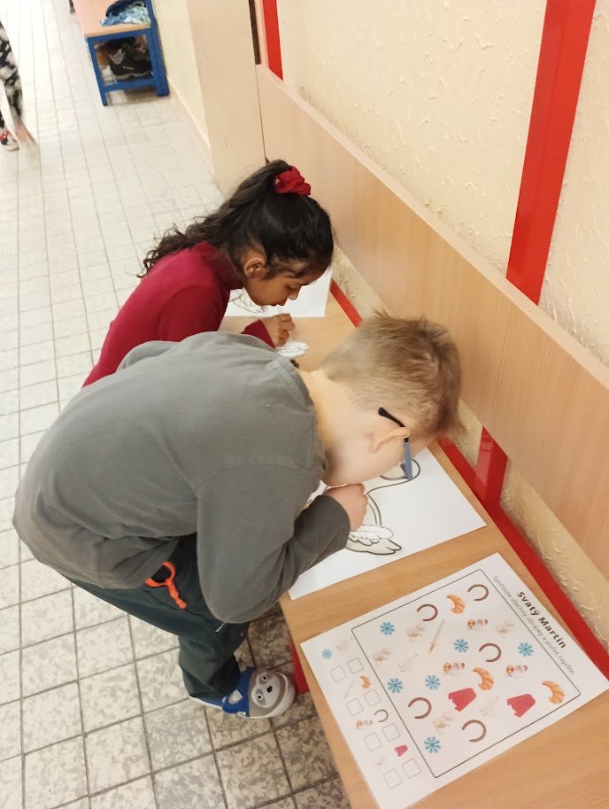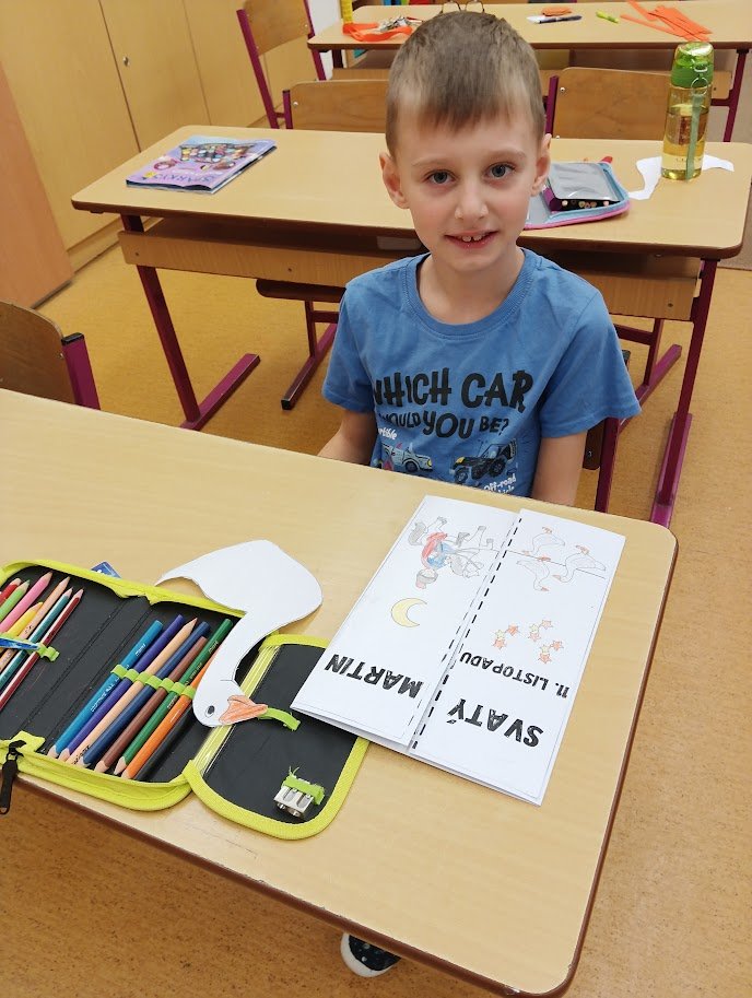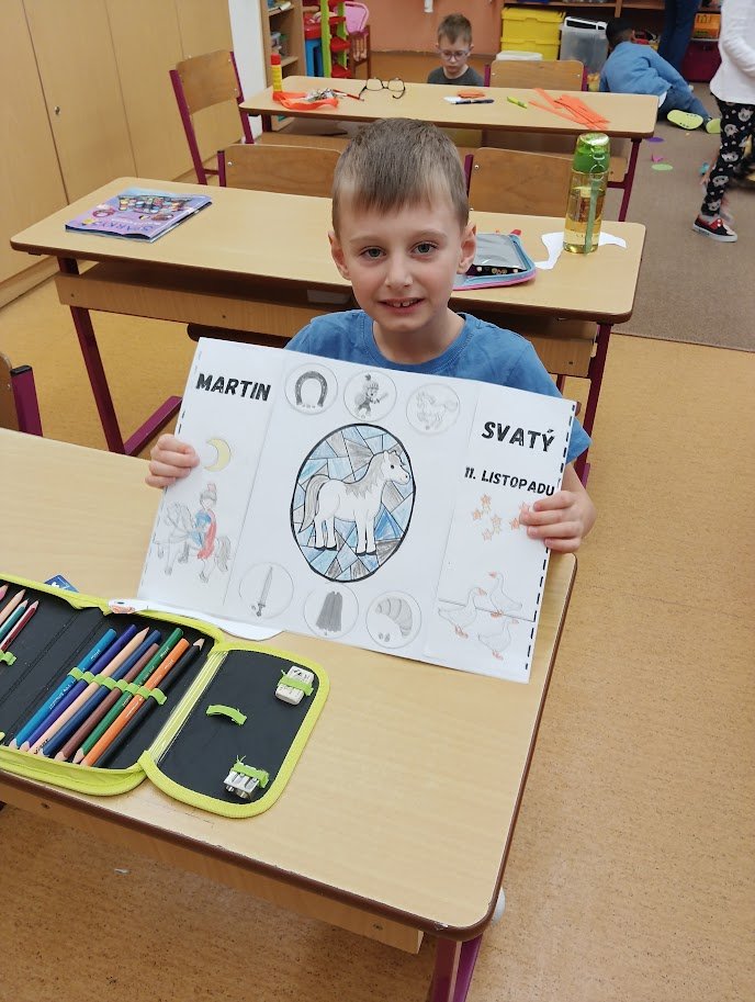 Nejprve jsme se společně seznámili s legendou o Martinovi, vytvořili si lapbook, kde se potrénovalo určování slabik, pravidelné střídání prvků, hledaly se stíny, vybarvovalo se podle čísel. Zahráli jsme si společně hru Já mám, kdo má na podporu slovní zásoby, zkoušeli jsme cválat na židličkách jako Martin na koni a také jsme plnili různé úkoly na stanovištích na chodbě. Děti se tak v pohybu vystřídaly na řadě úkolů, které na ně čekaly. Čas velmi rychle utekl a dva dny s Martinem byly završeny tvorbou husy a koně, které k Martinovi neodmyslitelně patří.