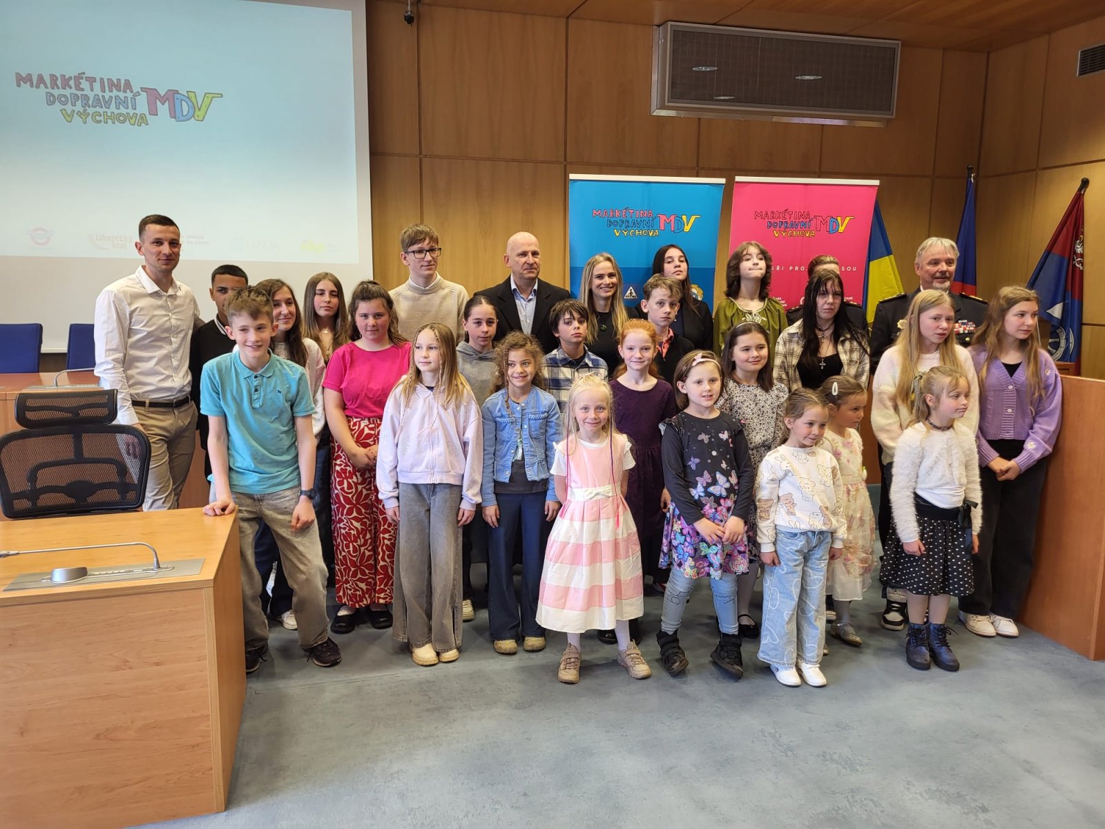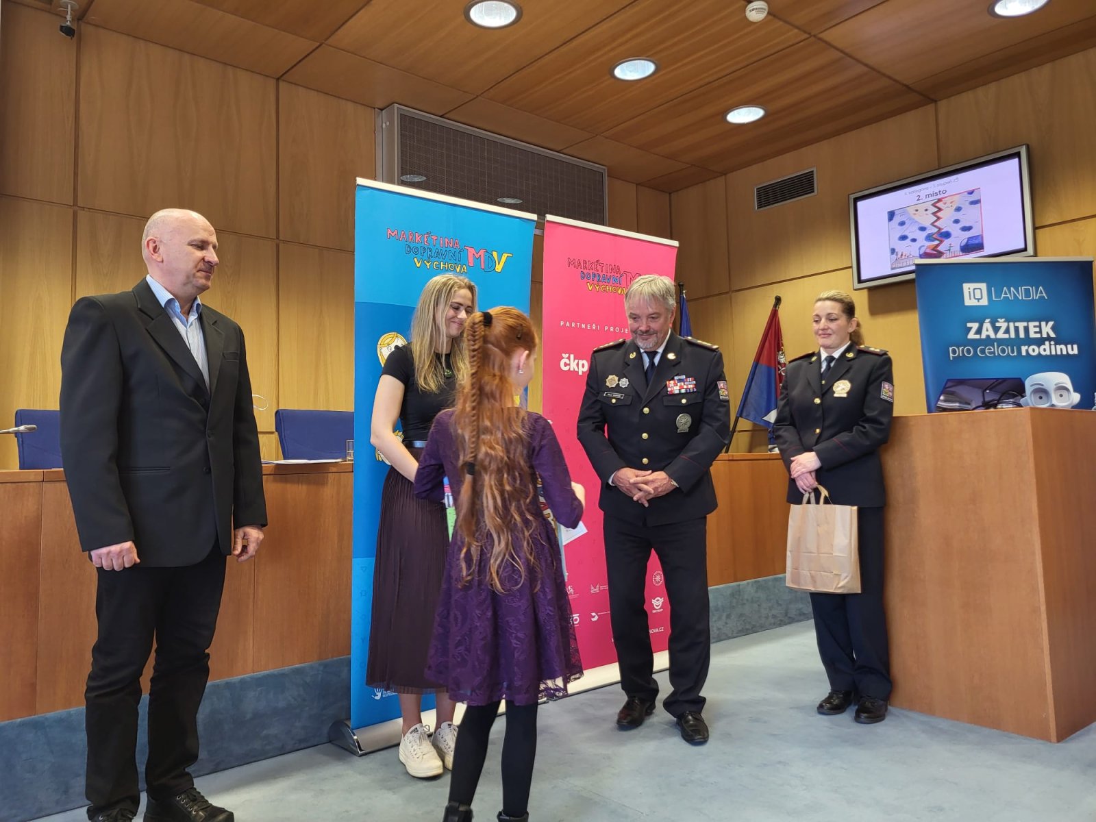 Soutěž je i edukativní formou dopravní výchovy. Děti z Výtvarného kroužku školní družiny se opakovaně zapojily. V letošním roce probíhá 13. ročník, ve kterém jsme měli opět úspěch. Žákyně 3. C Tereza Burianová se ve své kategorii umístila na úžasném druhém místě. Výtvarnou část tvoří čtyři kategorie, do kterých bylo zasláno téměř pět set prací. V pátek 24. 4. byla Terezka pozvána do Liberce. V zastupitelském sále na Krajském úřadě Libereckého kraje bylo slavnostní předávání ocenění. Představitelé Krajského úřadu, Policie i Týmu bezpečnosti děti ocenili, poděkovali jim a předali krásné tematické dárky. Následně byli všichni pozváni na malé občerstvení. Tečkou byla možnost navštívit vyhlídkovou terasu v 17. patře. Výhled z této výškové budovy byl opravdu parádní. Terezce gratuluji a děkuji za vzornou reprezentaci školy. Přejme jí štěstí, protože postoupila do kola celostátního.