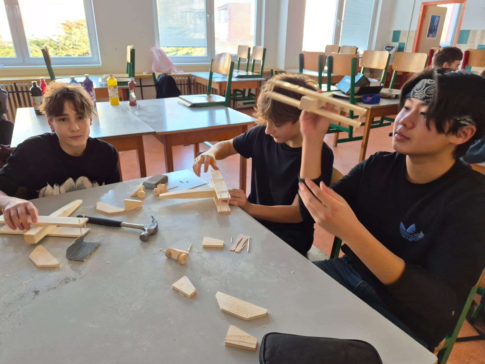 Během hodin vznikají trojrozměrné objekty, modely i autorské práce, v nichž žáci zkoumají vztah tvaru, prostoru a funkce. Práce se dřevem rozvíjí manuální zručnost a bezpečné zacházení s nástroji, papír a karton naopak podporují experimentování, lehkost a práci s konstrukcí. Každý projekt vede žáky k samostatnému rozhodování a schopnosti obhájit vlastní řešení.