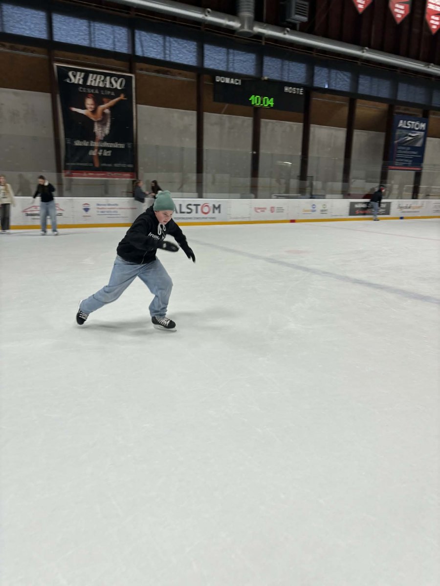 Ledová plocha se proměnila v rej plný smíchu a energie. Na ledě se potkali všichni bez rozdílu dovedností. Zatímco zkušení bruslaři s lehkostí řezali zatáčky a zkoušeli odvážné piruety, začátečníci statečně bojovali s rovnováhou. Bylo skvělé sledovat, jak si spolužáci vzájemně pomáhají – stačilo pár rad od zkušenějších a i ti, co stáli na bruslích poprvé, brzy s jistotou kroužili po stadionu.