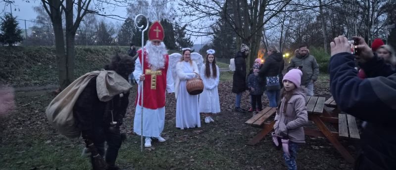 Už od začátku panovala příjemná atmosféra, přestože počasí nám tentokrát příliš nepřálo. Akci jsme zahájili čertí stezkou, na které čekalo deset zábavných úkolů. Žáci ji prošli s nadšením a všichni úspěšně splnili jednotlivá stanoviště. Po stezce se děti přesunuly k ohništi. Oheň se nám zpočátku nedařilo zapálit, ale nakonec pomohl jeden z tatínků, který ochotně přiložil ruku k dílu. Díky tomu si všichni mohli opéct svůj vuřt a užít si malé předvánoční setkání. Na akci dorazili také Mikuláš, anděl a čert. Žáci jim zazpívali a přednesli připravené básničky, za což si vysloužili úsměvy i drobnou odměnu. Celé odpoledne proběhlo ve velmi milém duchu, a i přes nevlídné počasí se akce vydařila.