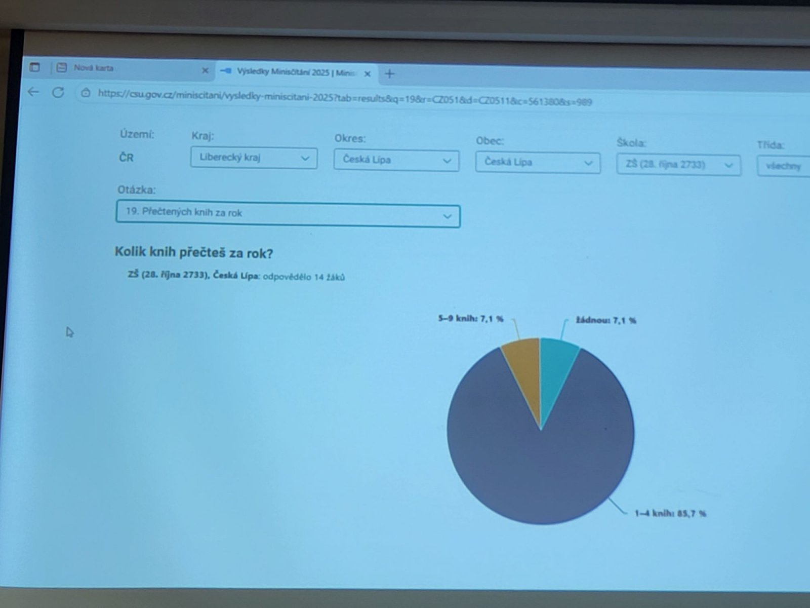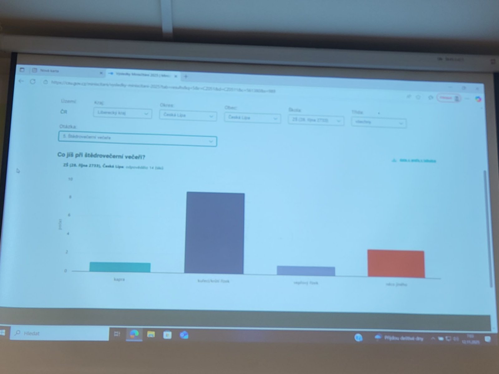 Dotazník k Minisčítání vyplnili žáci v rámci hodiny OSV. A tak jsme se například dozvěděli, že na Štědrý den v nejvíce rodinách jedí kuřecí řízek a ve třídě máme jednoho naprostého nečtenáře.