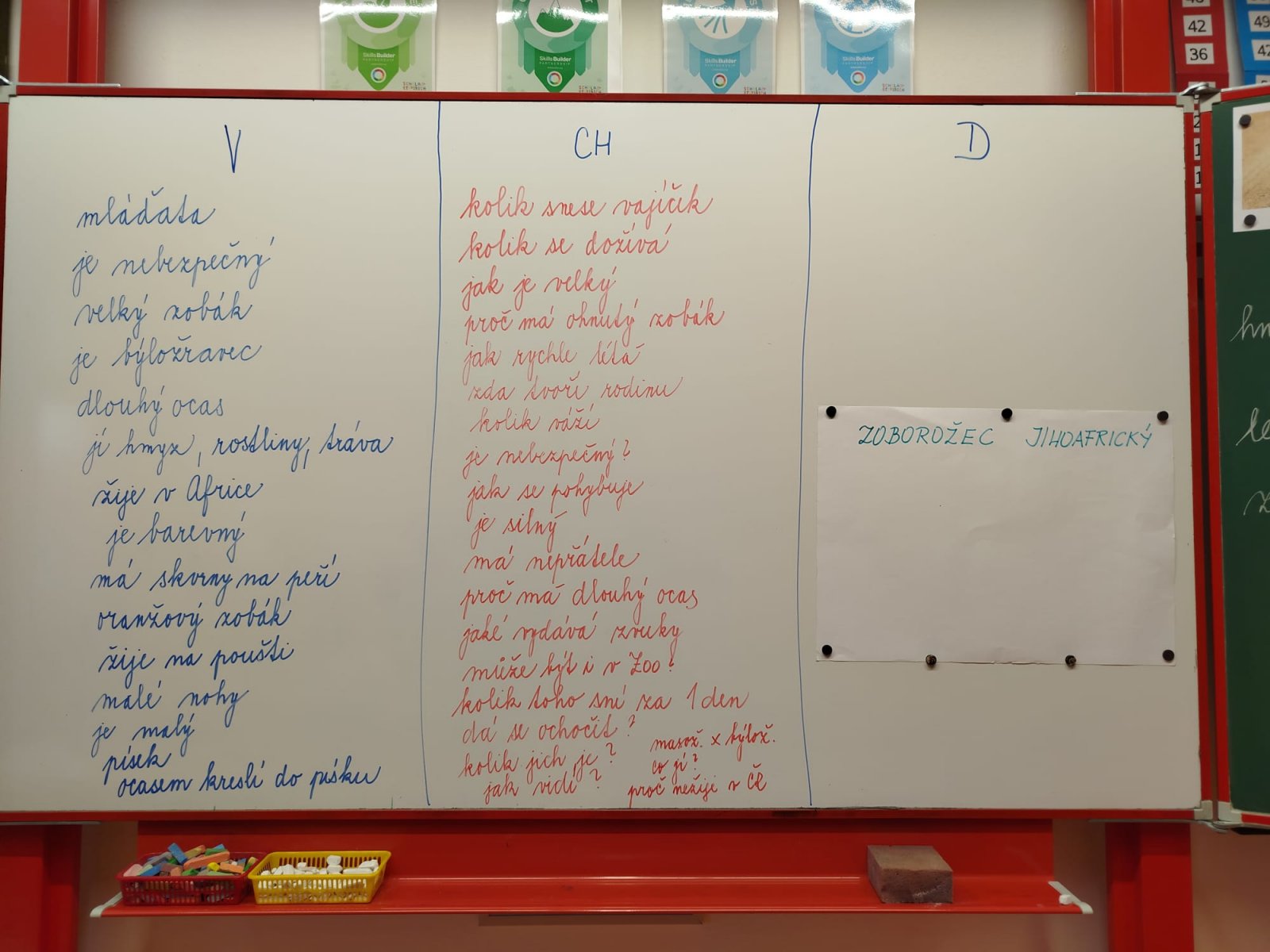 Zapisovali jsme vše na tabuli pod písmenko V (vím), porovnávali zapsané a společně tvořili otázky pod písmenko CH (chci vědět) a přemýšleli nad tím, jaké informace bude potřeba doplnit a kde je najít. Následovalo rozdělení do expertních týmů, kde se každý tým zaměřil na jedno dílčí téma – životní prostředí zoborožce, potravu, vzhled, chování a zajímavosti.