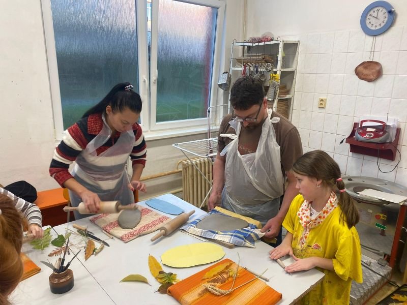 Skupinka dětí spolu se svými rodiči zaplnila celou keramickou dílnu a všichni se pustili do díla. Základem pro práci byl vyválený plát z hlíny, do kterého tvůrci otiskli přírodninu. A tak nám nechyběly otisky listů, klásků, levandule, travin a dalších darů přírody. Výrobky ze stejného základu byly velmi rozmanité! Pod rukama rodinných dvojic vznikaly oválné tácky na sušenky, kulaté tácky na cokoliv, mýdlenky i talířky ve tvaru listů. Při odchodu domů si všichni mohli prohlédnou výstavu ze surových výrobků. Tvoření bylo tematicky podzimní, ale zážitek a následné domácí využití výrobků bude celoroční. Nebojím se tvrdit, že i letité. Děkuji všem za příjemné páteční odpoledne.