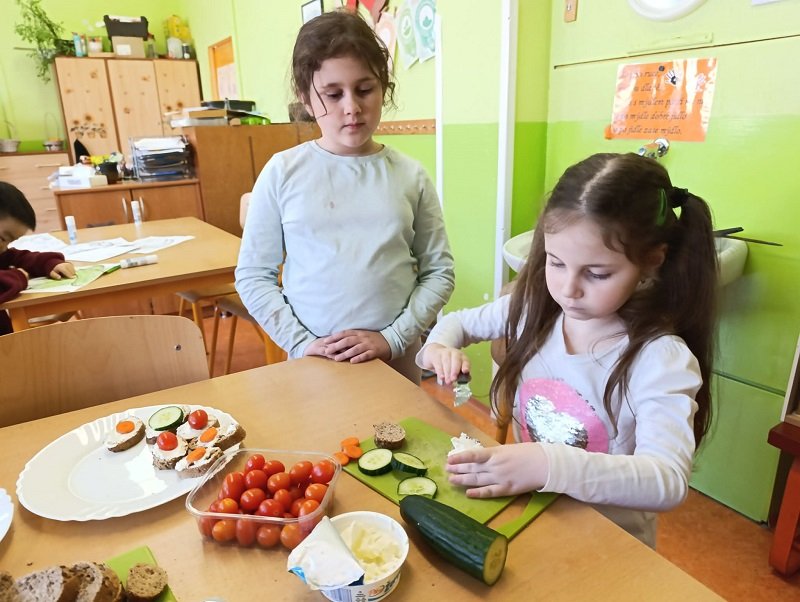 Na závěr jsme se pustili do výroby zdravých jednohubek z celozrnné bagetky, žervé a čerstvé zeleniny. Děti si musely bagetku samostatně namazat, což pro naše malé kuchaře nebylo vůbec jednoduché – mazání jim dalo pořádně zabrat. Přesto to nevzdaly, děti vše zvládly a nakonec si své jednohubky s radostí dozdobily. A co je nejdůležitější – všem moc chutnaly!