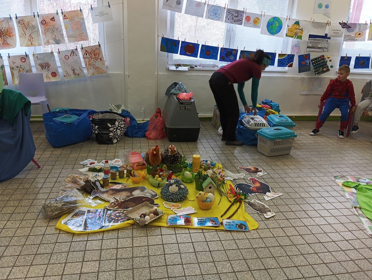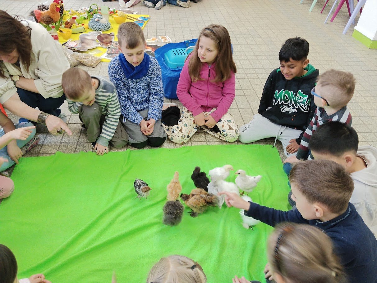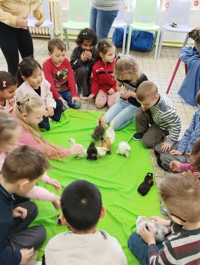 Nejprve byla trochu teorie, ale pak se z přepravek začaly vynořovat slepice, kuřata, králíci, morčata. Děti nejprve překvapeně koukaly, ale pak si téměř všichni nějakou živou učební pomůcku přivlastnili. Ze židle vše kontrolovaly dvě ochočené slepice, které nakrmené a spokojené seděly na židlích lépe než někteří žáci. Na závěr přišlo to největší překvapení, z přepravek vykouklo malé jehně a kůzle. Názorné pomůcky jsou prostě nej…
