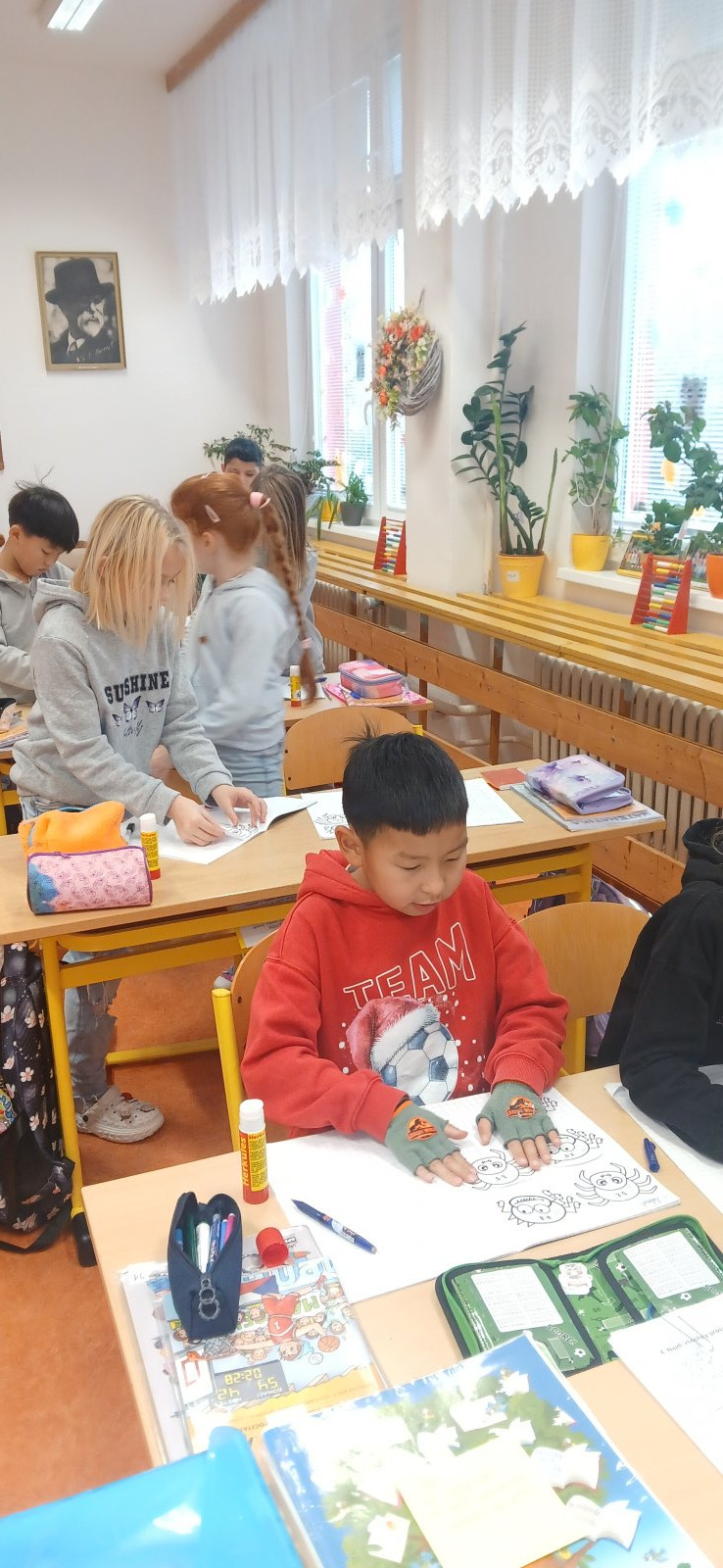Zúčastnili jsme se například halloweenského projektu, projektu Voda, navštívili jsme dopravní hřiště, park i řeku Ploučnici. Děláme čtenářské dílničky, spolupracujeme ve skupinách, tvoříme, chodíme ven a dokonce i hrabeme listí.