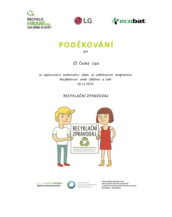 Svou účastí v celostátní soutěži Recyklohraní musíme pilně pracovat a zdolávat záludné úkoly. S prvním úkolem jsme se statečně poprali. Museli jsme vytvořit recyklační zpravodaj. Podmínky pro splnění zpravodaje byly náročné, ale snaha se nám vyplatila. Získali jsme PLNÝ počet bodů! Nyní nás čeká