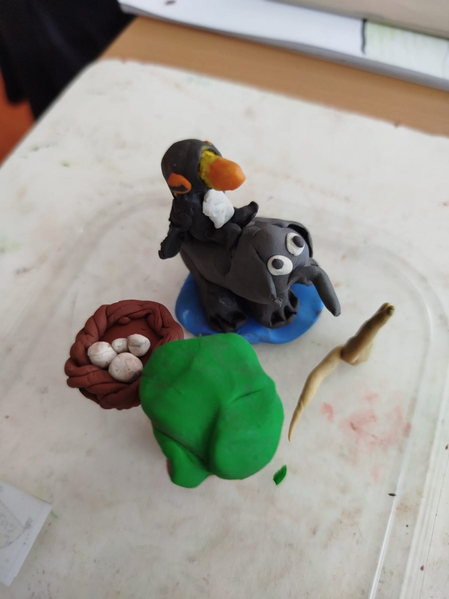 Poté nastala práce v expertních skupinách, kde každý žák měl svůj úkol. Děti se učily pracovat s textem a přetvářet informace do společné prezentace. Počítali jsme slovní úlohy, zkoušeli unést co nejvíce klubáků na vlastních zádech. Když jsme už věděli, kde klubák žije, podívali jsme se na videa z africké přírody. Víme, že pomáhá velkým savcům od parazitů, občasně si smlsne na jejich krvi. Žije však v souladu s jinými zvířaty - sloni ho moc nemusí, hroši klubáka zase moc nepotřebují, ale zebry, buvoli, antilopy, nosorožci, pakoně a další ti ho vítají a tolerují. S těmi je dobrý kamarád, jejich osobní čistička. Poté jsme si v hodině pracovní činnosti vymodelovali vlastní kousek africké divočiny – nechyběly stromy, zvířata ani samotní klubáci!