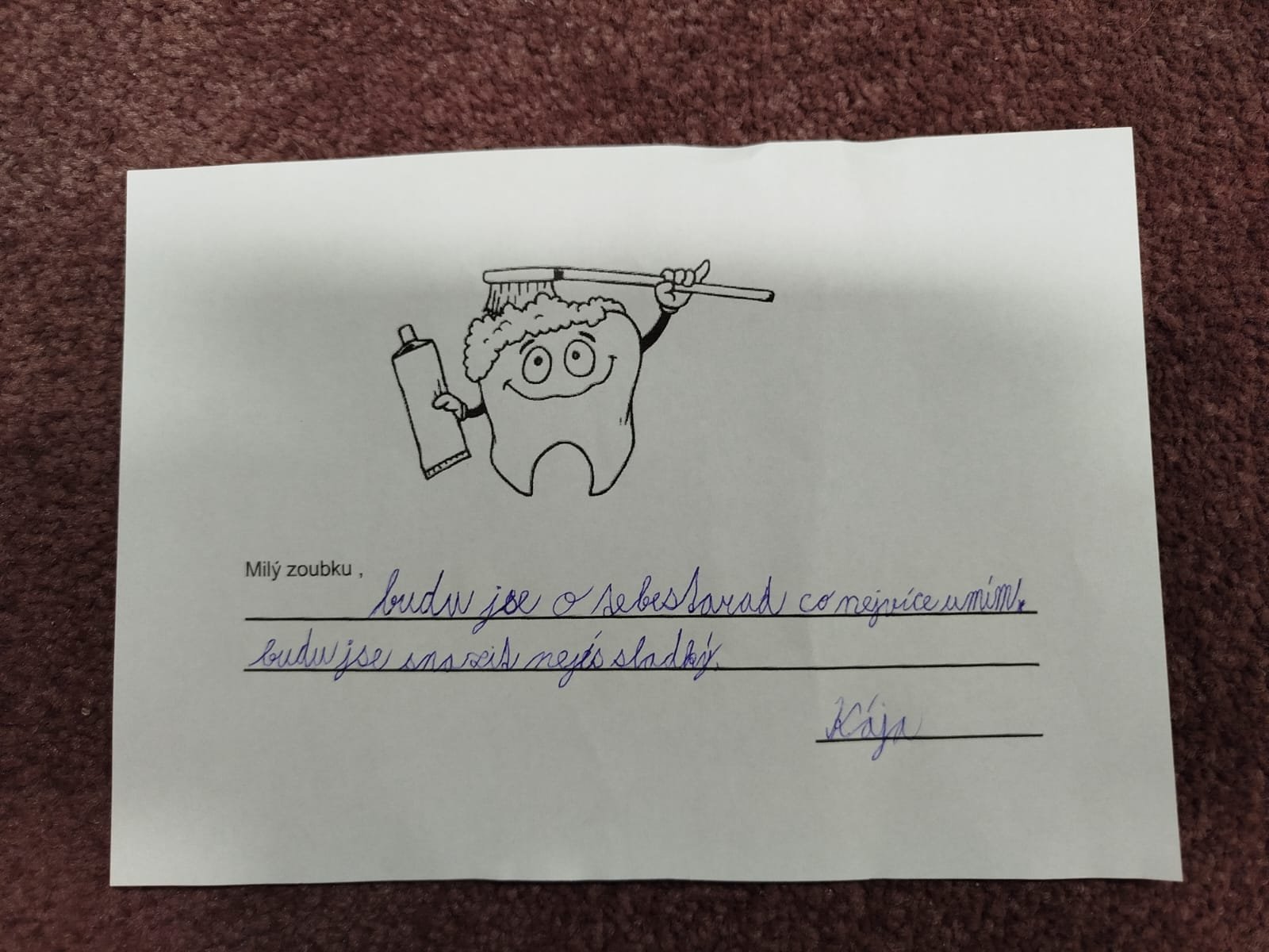 Diskuse se přirozeně přenesla i k péči o chrup, kde si děti připomněly, proč je důležité pravidelně čistit zuby, a jak by to asi dopadlo, kdyby se o ně nikdo nestaral. Kdo je zoubková víla, co jim nosí apod.