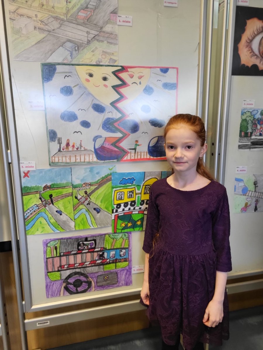 Soutěž je i edukativní formou dopravní výchovy. Děti z Výtvarného kroužku školní družiny se opakovaně zapojily. V letošním roce probíhá 13. ročník, ve kterém jsme měli opět úspěch. Žákyně 3. C Tereza Burianová se ve své kategorii umístila na úžasném druhém místě. Výtvarnou část tvoří čtyři kategorie, do kterých bylo zasláno téměř pět set prací. V pátek 24. 4. byla Terezka pozvána do Liberce. V zastupitelském sále na Krajském úřadě Libereckého kraje bylo slavnostní předávání ocenění. Představitelé Krajského úřadu, Policie i Týmu bezpečnosti děti ocenili, poděkovali jim a předali krásné tematické dárky. Následně byli všichni pozváni na malé občerstvení. Tečkou byla možnost navštívit vyhlídkovou terasu v 17. patře. Výhled z této výškové budovy byl opravdu parádní. Terezce gratuluji a děkuji za vzornou reprezentaci školy. Přejme jí štěstí, protože postoupila do kola celostátního.