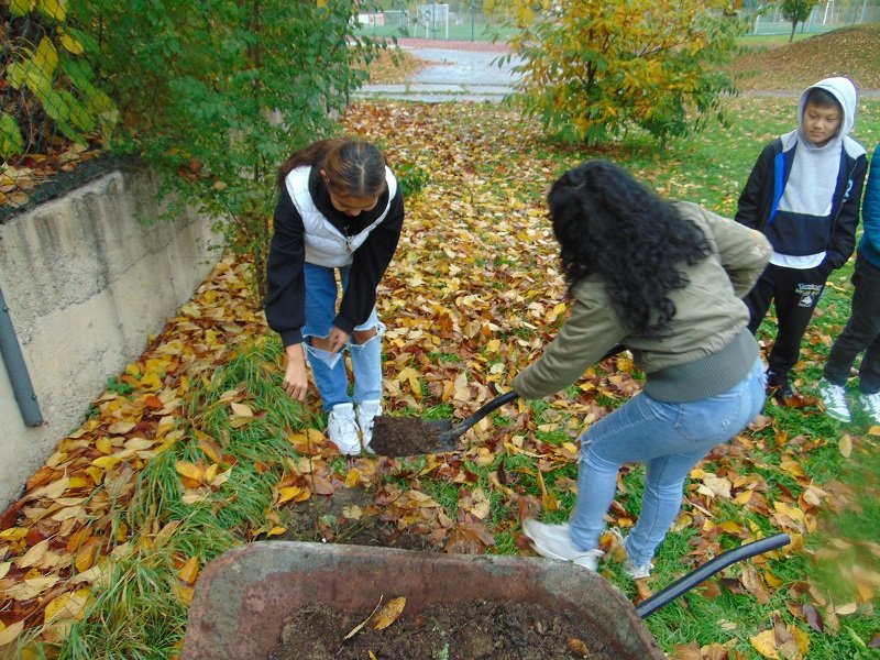 Na svahy mezi druhým a třetím pavilonem školy vysadila třída 6. D. moderní odrůdy sadových růží Felicitas a John Davis. 6. A. zasadila starou, odolnou, stále pěstovanou a uznávanou odrůdu Geschwind Nordlandrose.