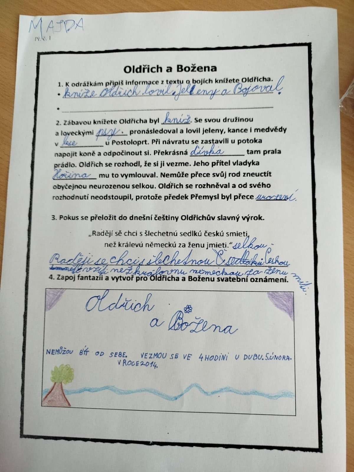 Hlavním tématem dnešního dne byl památný dub knížete Oldřicha a známá pověst o Oldřichovi a Boženě, která v sobě spojuje historii, přírodu i lidské osudy. V úvodu lekce jsme ve hře špioni odtajnili jména v pověsti vystupující. Dále jsme se zamýšleli, o čem by to asi mohlo být. V další hodině nebylo cílem jen poslouchat příběh, který jsme nahlas četli, ale především ptát se, přemýšlet, porovnávat a hledat pravdu ukrytou mezi fakty a domněnkami. Následně jsme si ukázali i památný starý dub nedaleko Loun, řekli jsme si, proč je památný a jaký význam pro nás má. Zopakovali jsme si základní znalosti o dubu, doplňovali údaje do pracovního listu a vytvářeli svatební oznámení pro Oldřicha a Boženu. V průběhu dne nám spolužačky zahrály na hudební nástroje, na které se učí.