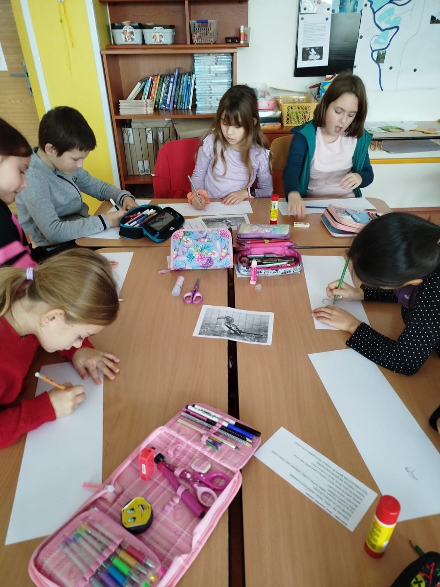 V následující hodině došlo na tvorbu proláže z barevného i černobílého obrázku. Správně je srovnat byl celkem náročný úkol. Vrcholnou částí projektu byla tvorba originálního plakátů o zoborožci jihoafrickém.