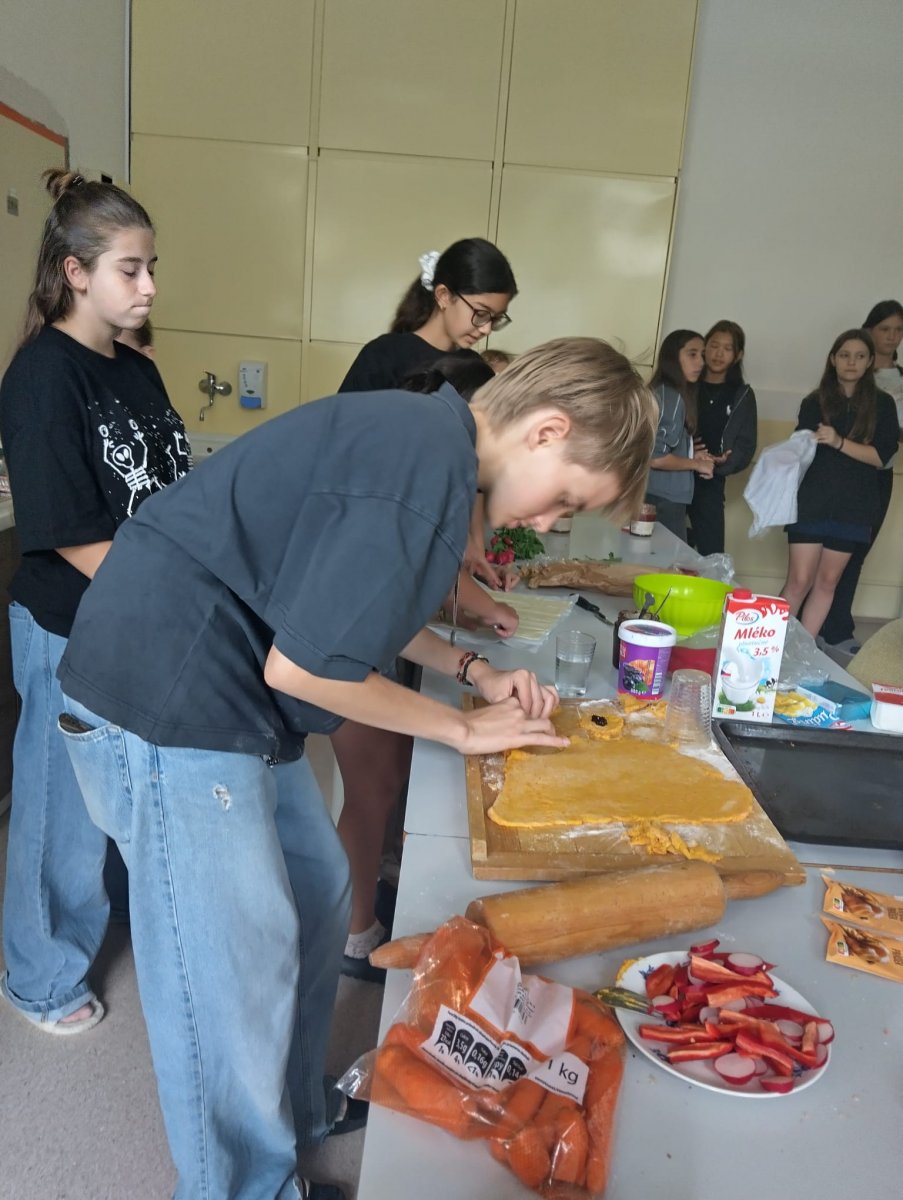 Starší děvčata nejprve ukázala svým novým kamarádkám a spolužačkám, jak se v ní pohybovat bezpečně, a poté se pustila do přípravy různých pochoutek. V pěti skupinkách tak vznikaly palačinky, zdravé pomazánky, tvarohové koblihy a také mrkvové šátečky. Zatímco děvčata tvořila v kuchyni, kluci se s panem učitelem rozvíjeli technicky a připravovali dekorace na nadcházející ZAHRADNÍ SLAVNOST. Spolupráce byla skvělá a žáci si i díky ní našli nové parťáky pro školní čas.