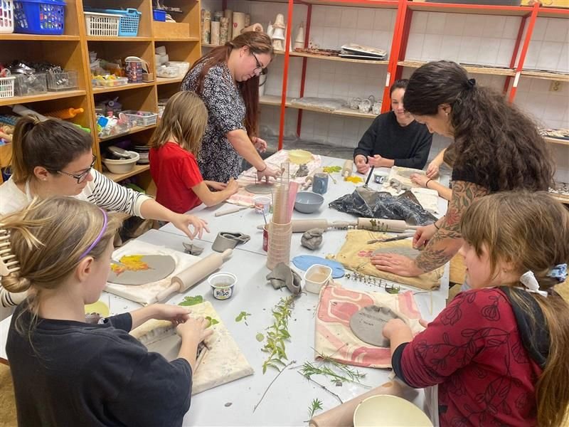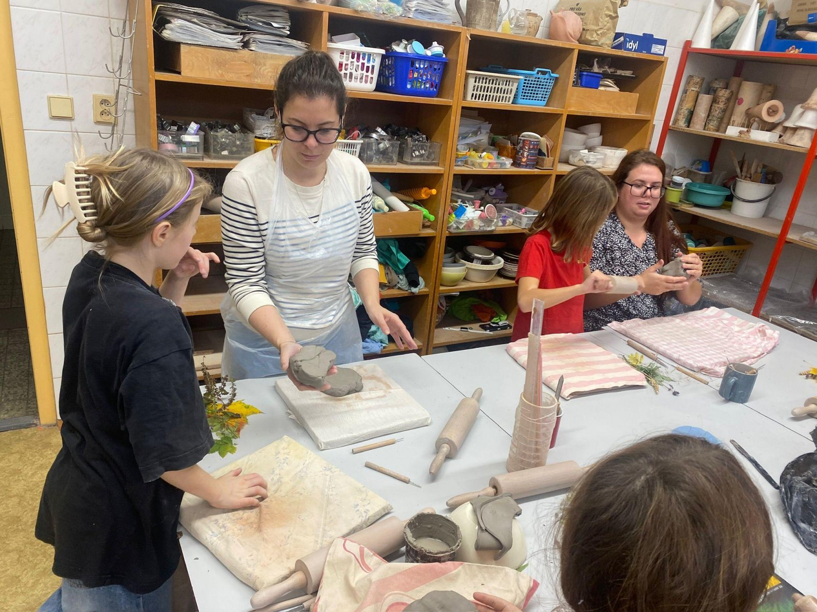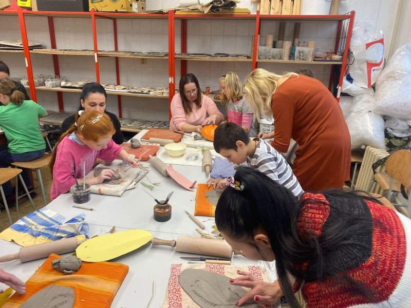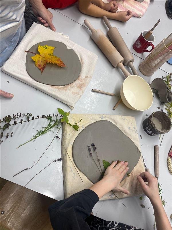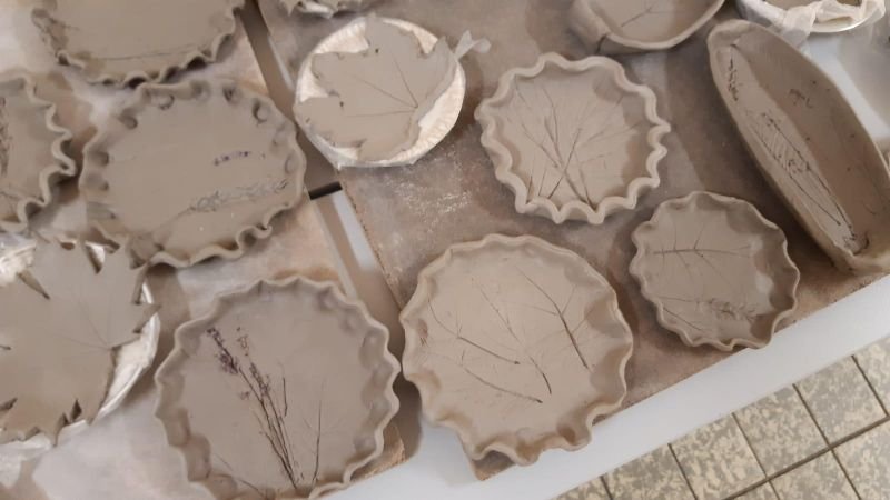Skupinka dětí spolu se svými rodiči zaplnila celou keramickou dílnu a všichni se pustili do díla. Základem pro práci byl vyválený plát z hlíny, do kterého tvůrci otiskli přírodninu. A tak nám nechyběly otisky listů, klásků, levandule, travin a dalších darů přírody. Výrobky ze stejného základu byly velmi rozmanité! Pod rukama rodinných dvojic vznikaly oválné tácky na sušenky, kulaté tácky na cokoliv, mýdlenky i talířky ve tvaru listů. Při odchodu domů si všichni mohli prohlédnou výstavu ze surových výrobků. Tvoření bylo tematicky podzimní, ale zážitek a následné domácí využití výrobků bude celoroční. Nebojím se tvrdit, že i letité. Děkuji všem za příjemné páteční odpoledne.