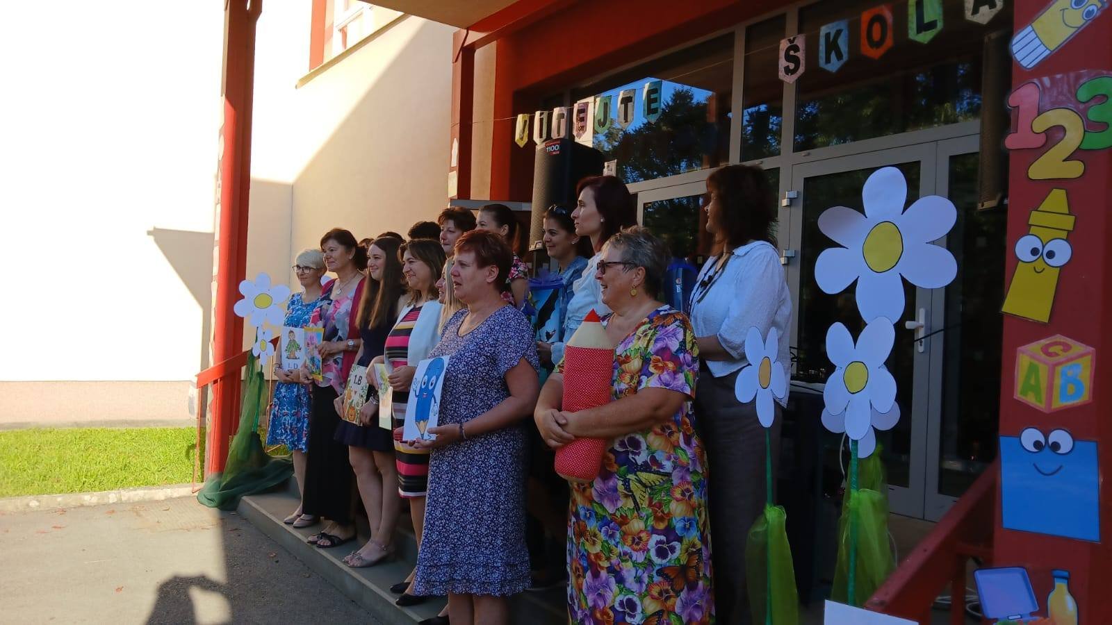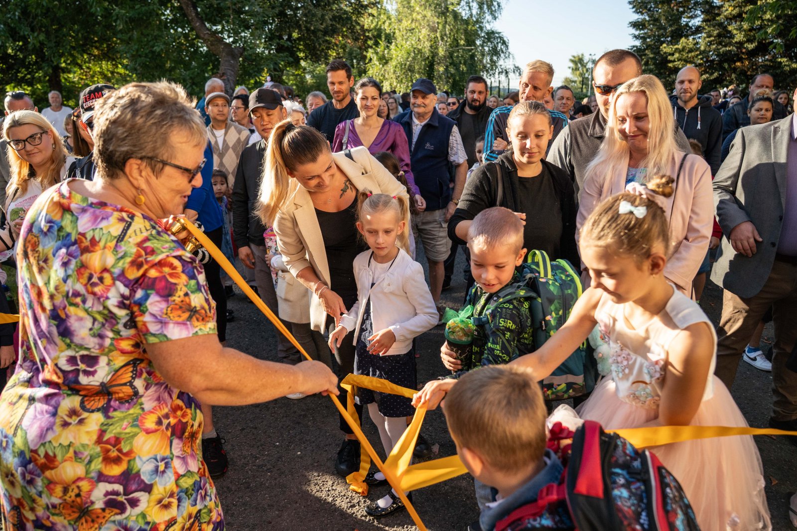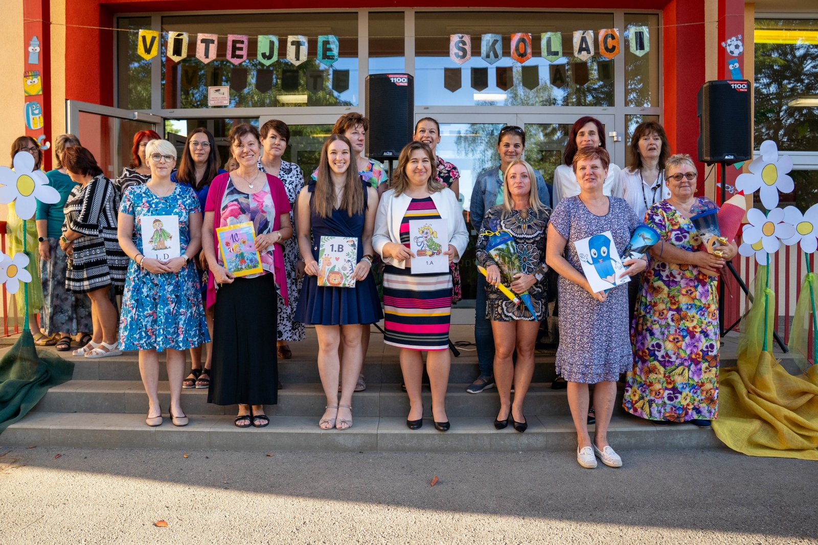 Prvňáčky a děti z přípravných tříd spolu s jejich rodiči i prarodiči přivítal na školní zahradě kolektiv pedagogických pracovníků v čele s paní ředitelkou a paní Nelou Cyrmon Theerovou.