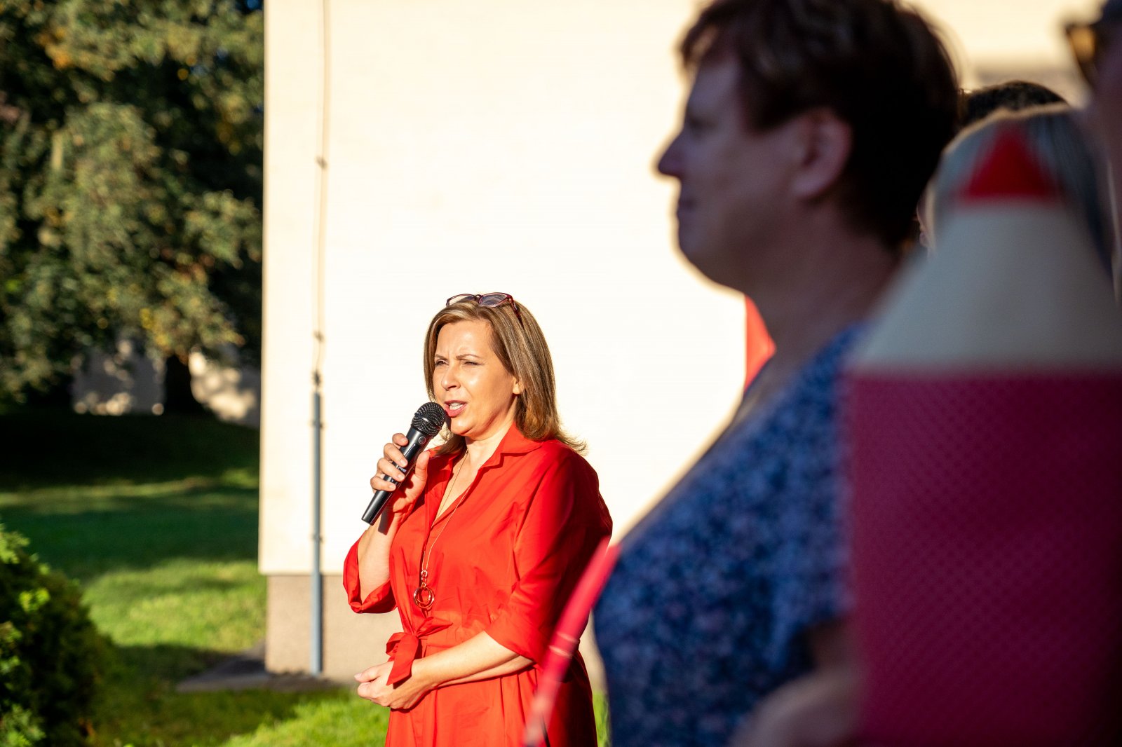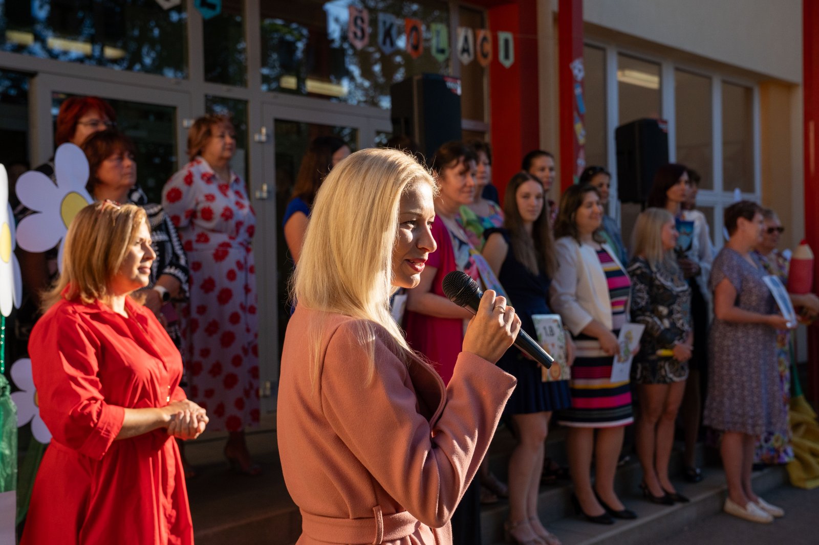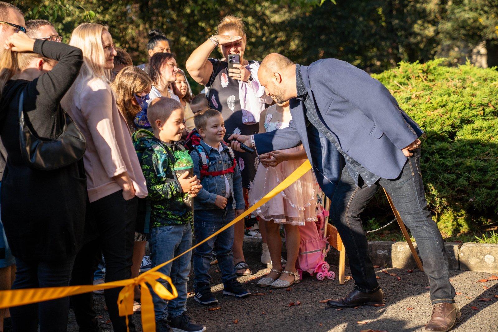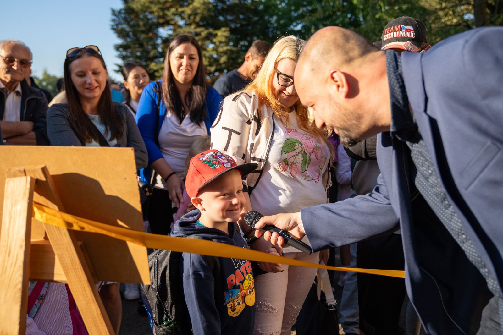 Prvňáčky a děti z přípravných tříd spolu s jejich rodiči i prarodiči přivítal na školní zahradě kolektiv pedagogických pracovníků v čele s paní ředitelkou a paní Nelou Cyrmon Theerovou.