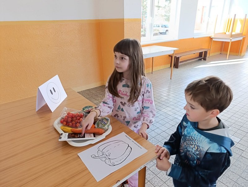 Pomocí hodného a zlého smajlíka jsme třídili různé potraviny podle toho, zda jsou zdravé, nebo méně vhodné. Děti se aktivně zapojily a často samy překvapily, jak dobře dokážou potraviny rozpoznat.