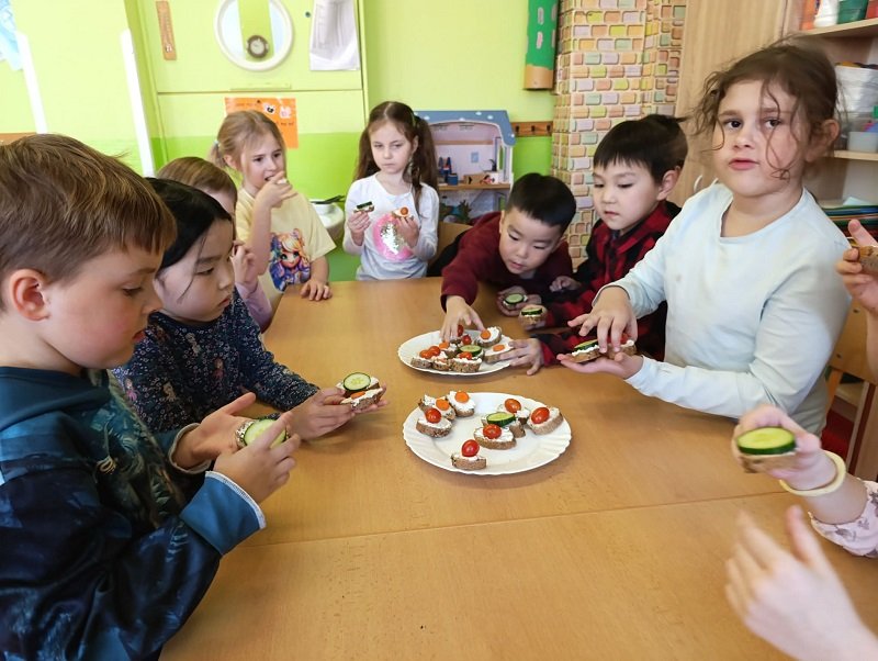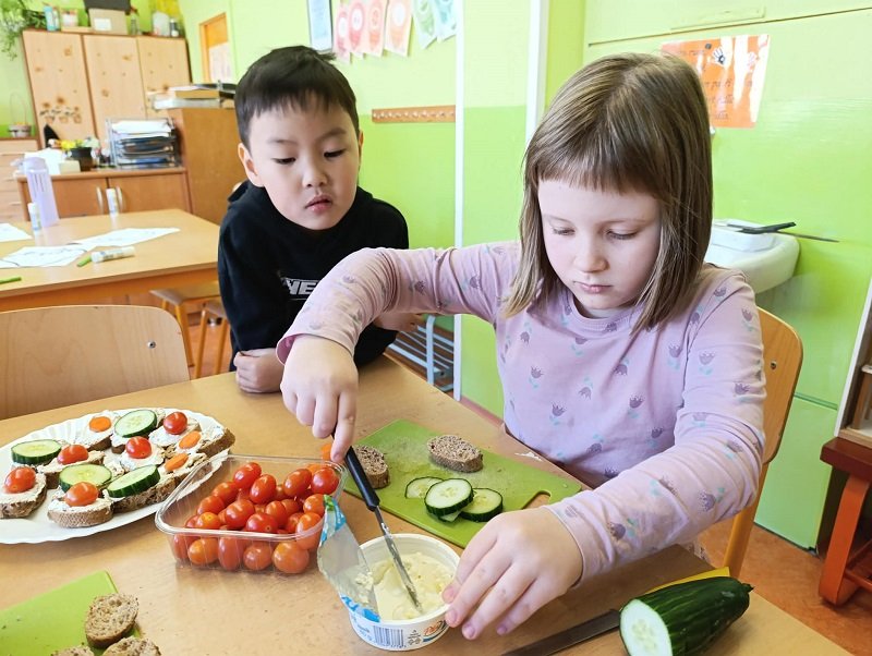 Na závěr jsme se pustili do výroby zdravých jednohubek z celozrnné bagetky, žervé a čerstvé zeleniny. Děti si musely bagetku samostatně namazat, což pro naše malé kuchaře nebylo vůbec jednoduché – mazání jim dalo pořádně zabrat. Přesto to nevzdaly, děti vše zvládly a nakonec si své jednohubky s radostí dozdobily. A co je nejdůležitější – všem moc chutnaly!